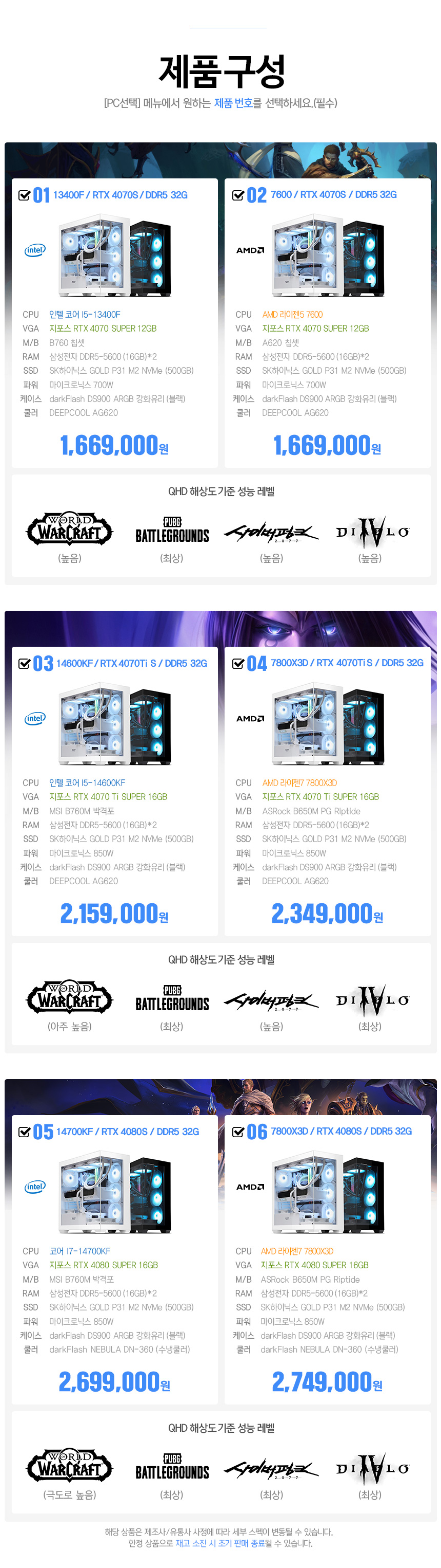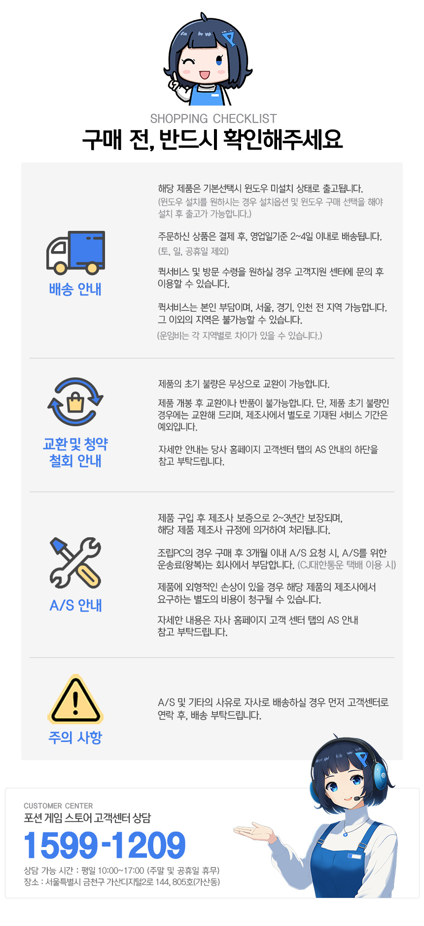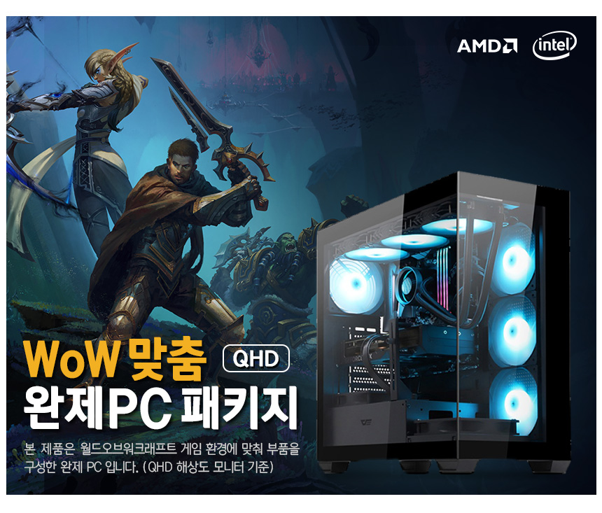 QHD 해상도에 최적화되어 각 옵션별로 구성된 완제 PC입니다.사은품으로 WOW 90일 이용권 패키지 + 포션 일러스트 장패드(4종중 1종) + 2024 포션달력이 증정됩니다