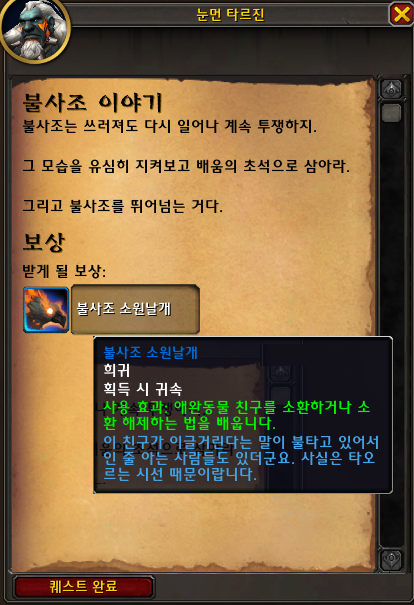 그에게 말을 걸면 그동안 재료를 대가로 불사조 소원날개 펫을 얻을 수 있습니다. 눈먼 타르진 퀘스트를 완료하지 않았다면 진행이 안됩니다.