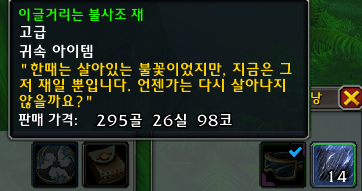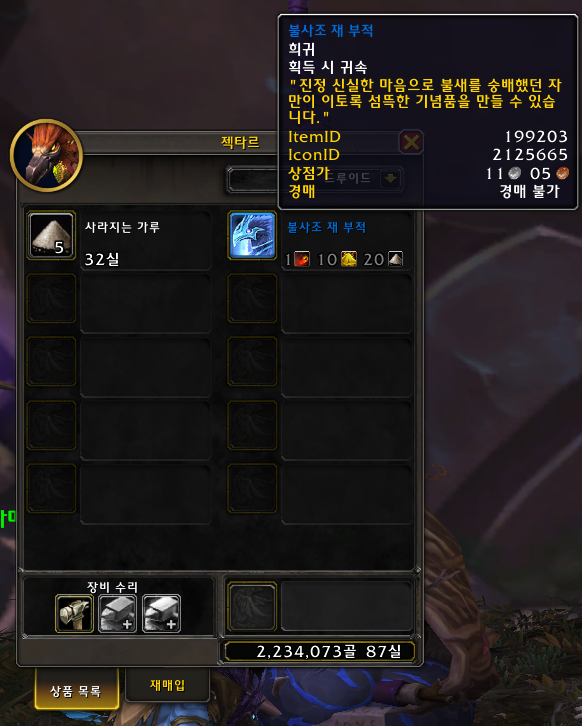 만약 이 npc와 대화가 안된다면 아라크 첨탑 퀘스트 중에 까마귀가 해를 삼키면을 좀 진행해야 합니다. 1~3단게에서 모은 아이템으로 젝타르에게서 불사조 재 부적이라는 아이템을 삽니다.