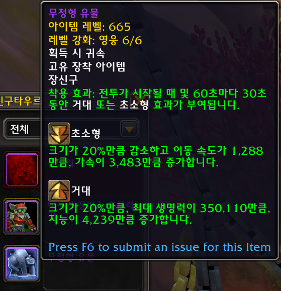 - 착효: 전투가 시작될 때 및 60초마다 30초 동안 거대 또는 초소형이 부여됩니다.