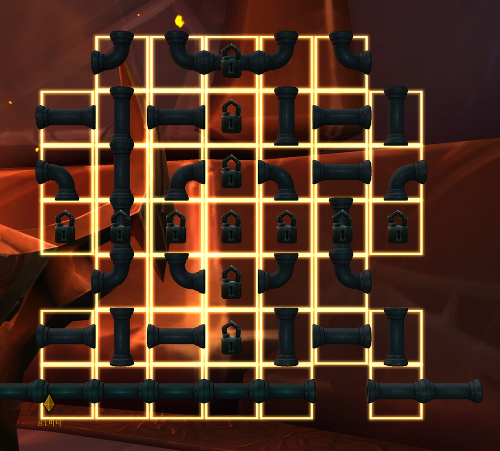 (*수도관 연결 퍼즐의 모습. 맨 아래 줄에 보면 모서리에 각각 1개의 수도관이 튀어나와있는데, 저걸 연결 시키면 됩니다. 즉 ㅡ 모양 하나 내리면 됩니다.)