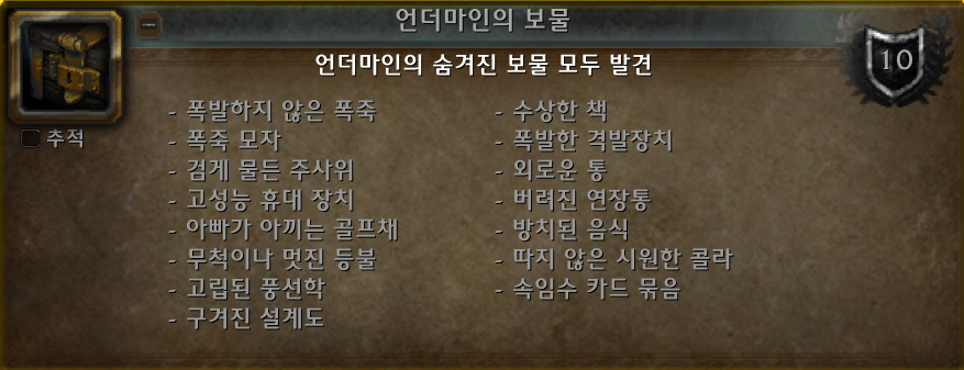 언더마인의 보물 업적은 언더마인에서 총 15개의 보물을 모두 찾는 업적입니다. 보물을 찾다보면 1개의 형상 및 2개의 장난감 등을 얻을 수 있습니다.