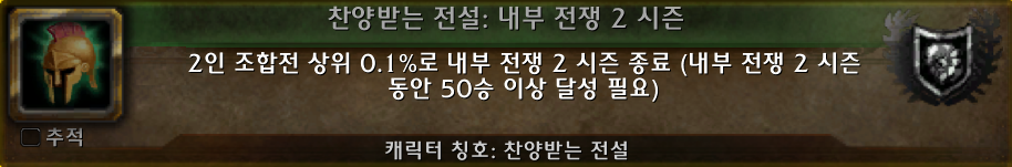 (*찬양받는 전설 칭호를 보상으로 주는 찬양받는 전설: 내부 전쟁 2시즌 업적의 모습.)