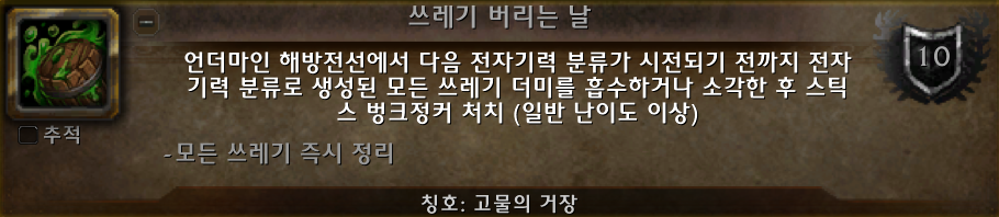 (*고물의 거장 칭호를 보상으로 주는 쓰레기 버리는 날 업적의 모습.)