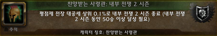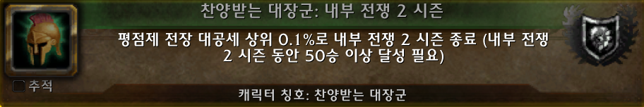 (*찬양받는 대장군 칭호를 보상으로 주는 찬양받는 대장군: 내부 전쟁 2시즌 업적의 모습.)