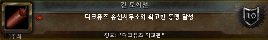 (*다크퓨즈 외교관 칭호를 보상으로 주는 긴 도화선 업적의 모습.)
