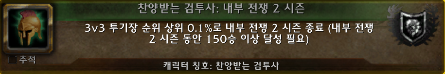 (*찬양받는 검투사 칭호를 보상으로 주는 찬양받는 검투사: 내부 전쟁 2시즌 업적의 모습.)