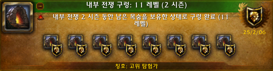 (*고위 탐험가 칭호를 보상으로 주는 내부 전쟁 구렁: 11레벨(2시즌) 업적의 모습.)
