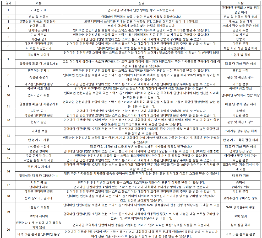언더마인에서 독보적으로 승승장구하는 인생을 살기 위해서는 실세들과 친분을 쌓아야 합니다. 여러 무역회사에서 제공하는 부업을 완료하세요. 용맹석과 전문 기술 제작법, 문장, 톱스키머 특제 로켓을 비롯한 탈것 등 다양한 보상을 얻을 수 있습니다. 톱스키머 특제 로켓은 영예 19 등급 달성 시 영예 병참장교 스막스 톱스키머에게서 받을 수 있고, 새로운 칭호 “폭발적인”은 20 등급에 받습니다.