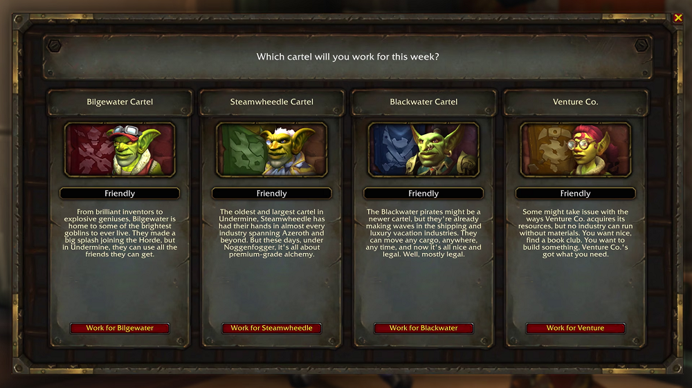 빌지워터: 발명가부터 폭발적인 천재들까지, 몬테 가즈로가 이끄는 빌지워터는 역사상 최고의 천재 고블린들을 품어온 요람입니다. 박살광장 인근의 빌지워터 주거지를 거점으로 삼아 사업 활동을 펼치고 있습니다.