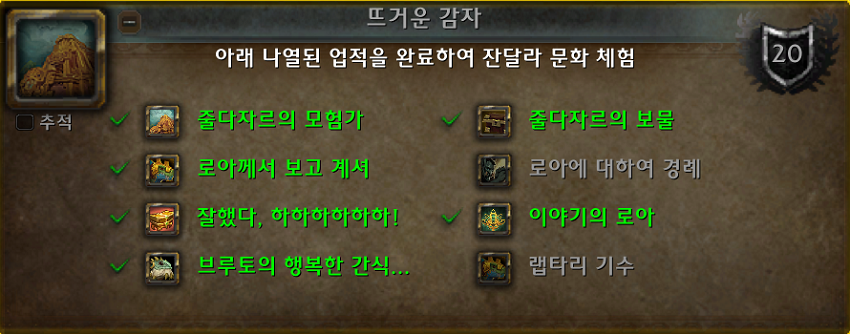 뜨거운 감자 - 아래 나열된 업적을 완료하여 잔달라 문화 체험.
