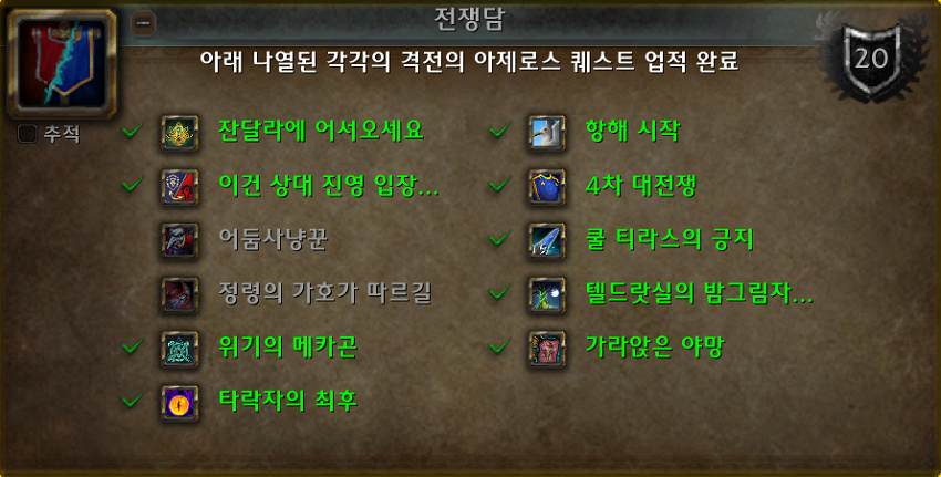 전쟁담 - 아래 나열된 각각의 격전의 아제로스 퀘스트 업적 완료.