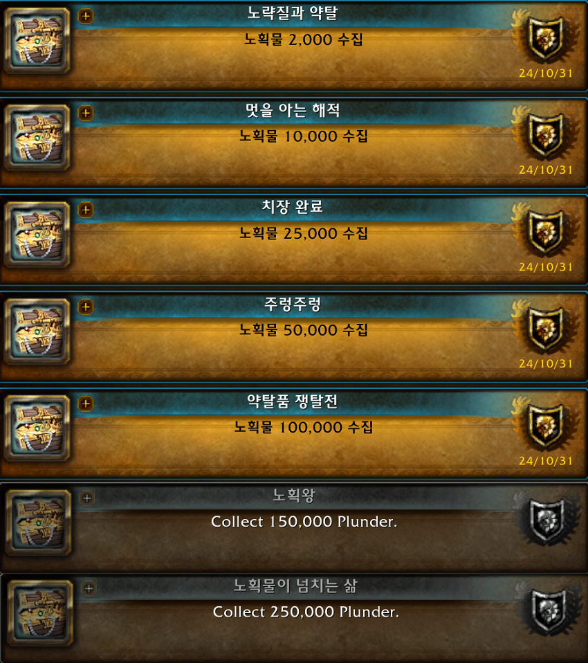 일정 위업이 약탈폭풍 관련해서 7개가 추가되었습니다. 다 노획물 수집 업적입니다. 백만개 위업을 하셨으면 바로 될겁니다.