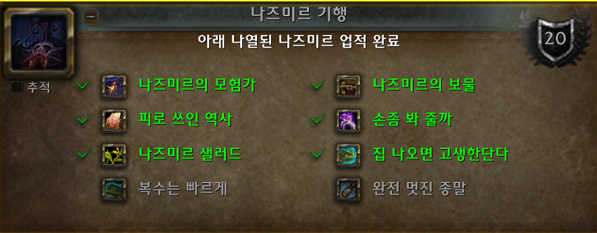 - 나즈미르의 모든 탐험 업적을 다 하면 됩니다. 일부는 호드 캐릭터만 할 수 있습니다.
