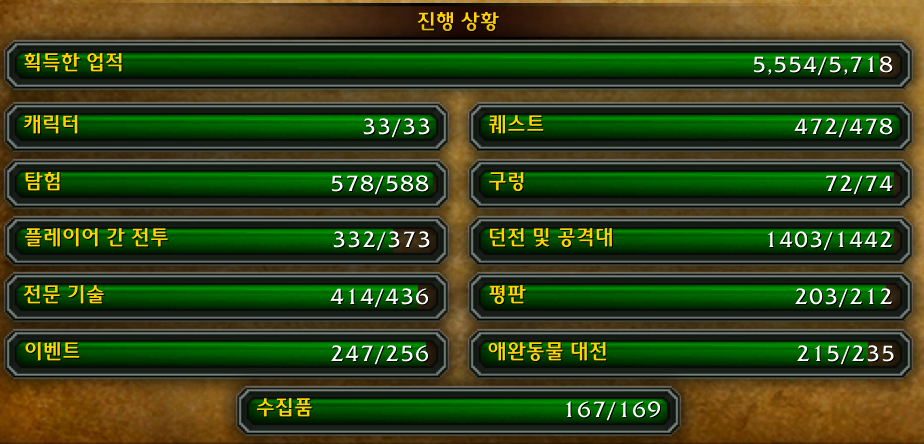 캐릭터, 구렁, 플레이어 간 전투, 전문기술, 평판, 애완동물 대전 업적은 추가된 것이 없습니다.