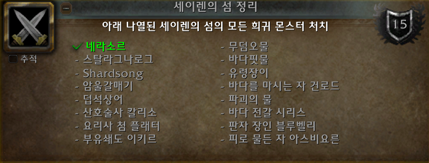 세이렌의 섬 정리 - 아래 나열된 세이렌의 섬의 모든 희귀 몬스터 처치.